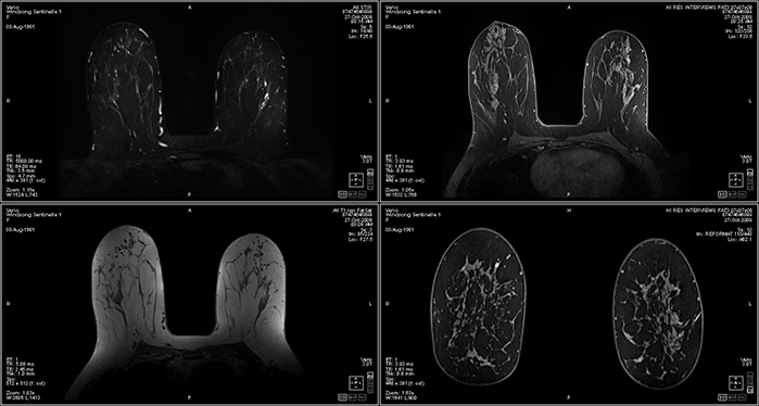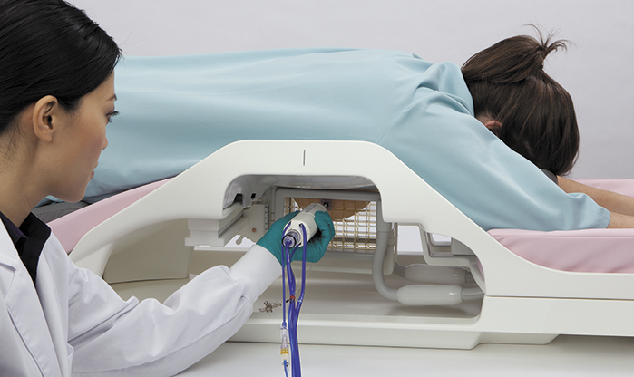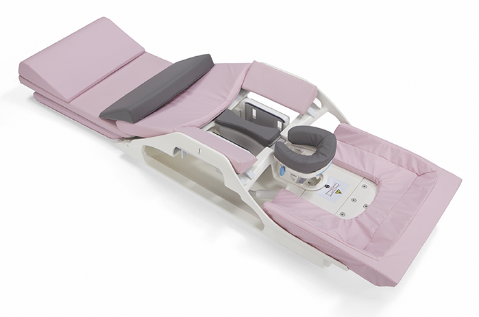 For high-quality imaging, the patient lies prone on the device with her breast(s) immobilized between the medial coil (under her sternum) and the lateral coils at the sides of her chest. Imaging can take over an hour so patient comfort is paramount, especially considering that movement compromises image quality. A lot of development went into padding to optimize comfort.