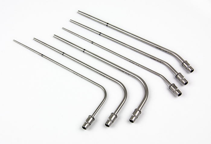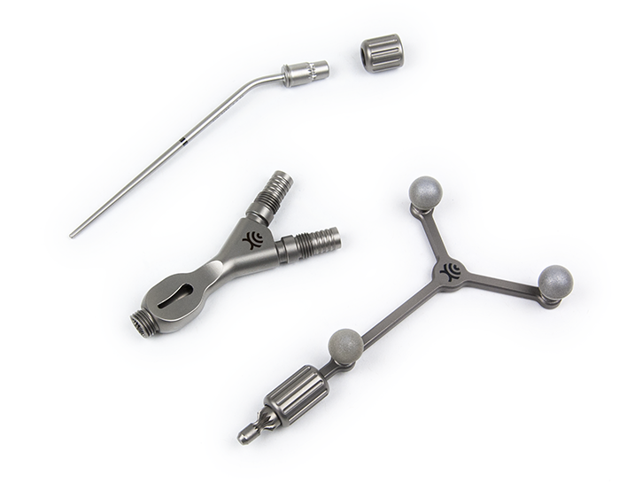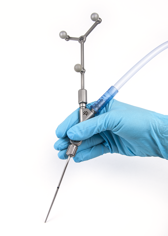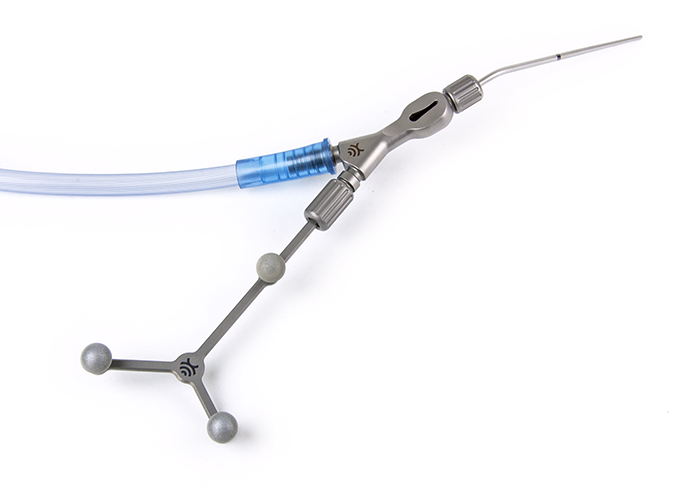 The instrument consists of three main parts: a handle, a tracking array, and a tube. The handle has two fittings; one is used to mount the tracking array, the other a flexible suction hose. The tracking array is a high-accuracy structure with three reflective marker spheres attached. Tubes come in a variety of lengths and diameters. They are semi-disposable meaning that they can be reused but eventually become damaged in use and have to be replaced.
