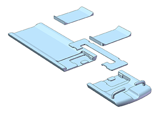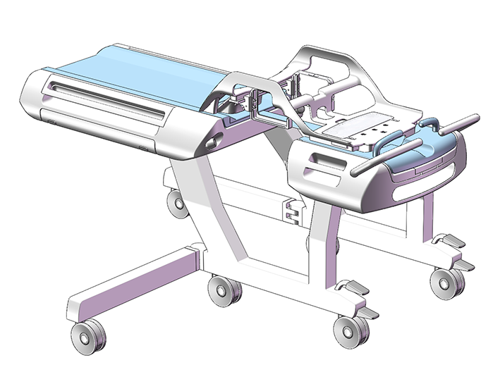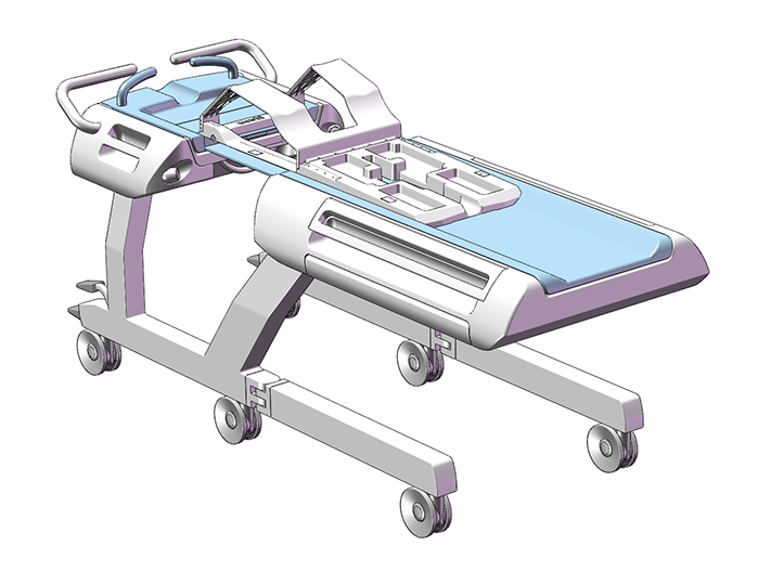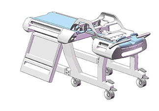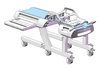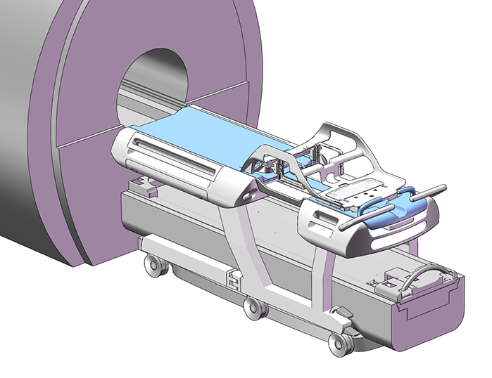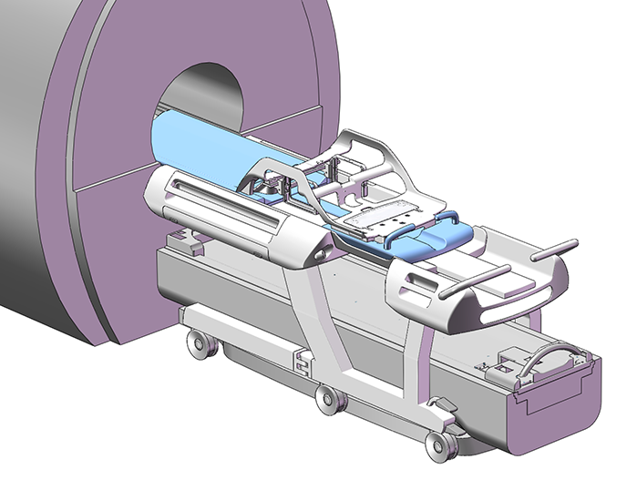 A concept for a reconfigurable transporter horizontal stage that can be used for many kinds of MRI imaging systems. For breast systems, the narrow element that connects the head and foot end of the stage is positioned at the centre. For prostate systems, it’s at the side. The gap between the head and foot end can also be closed off completely.